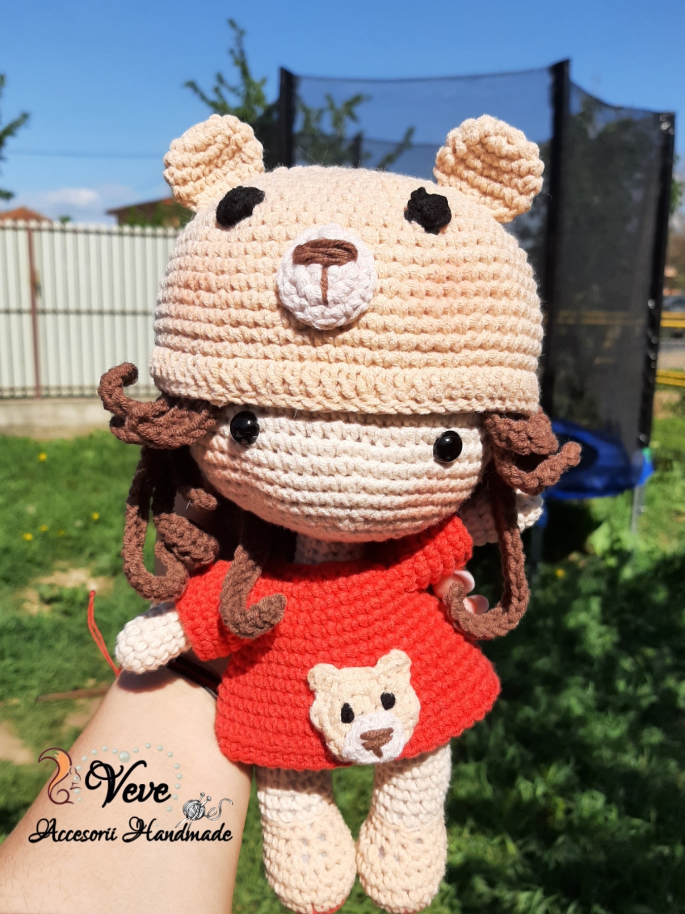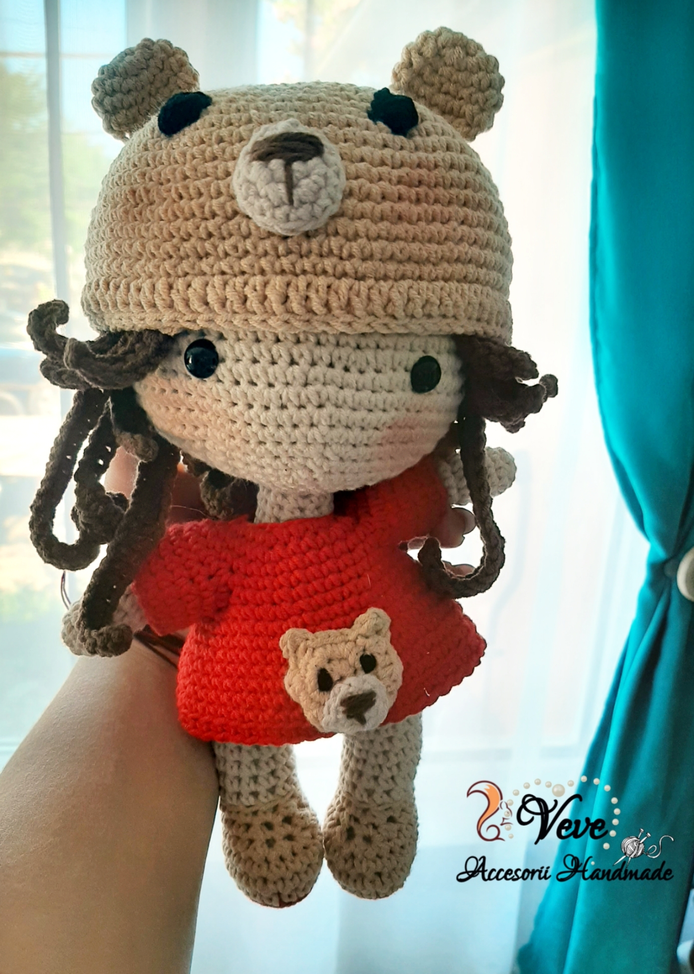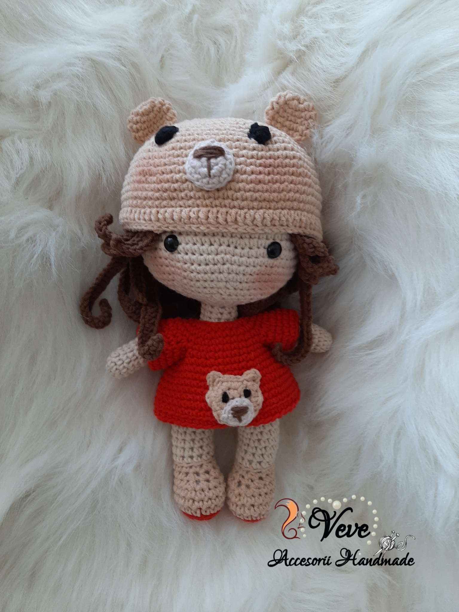 Această păpușică adorabilă este realizată manual prin tehnica amigurumi, perfectă pentru cei mici sau ca decor special într-o cameră copilărească. Poartă o căciuliță bej cu urechiușe și față de ursuleț, iar rochița roșie este decorată cu un ursuleț asortat. Detaliile fine și expresia dulce o fac un cadou minunat pentru orice ocazie.