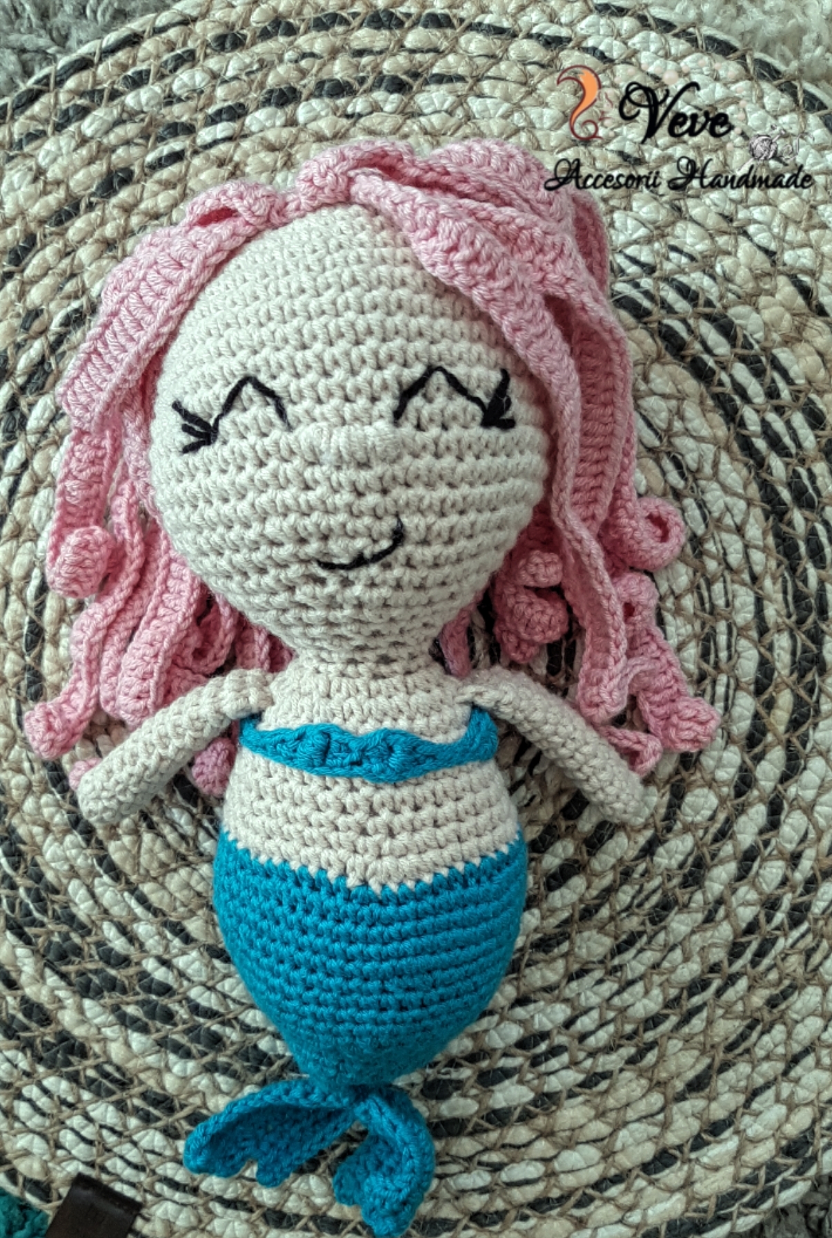 Simpatica sirena este realizată manual din fire speciale pentru jucării, măsoară aproximativ 20 cm înălțime, umplutura este antialergica.